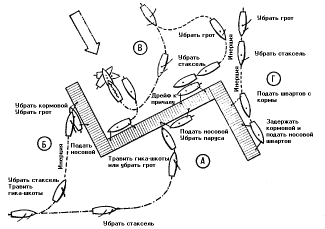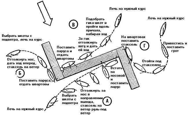 При ветре, дующем вдоль причала, яхту швартуют носом против ветра носовым и кормовым швартовами. Последний можно заложить серьгой. По готовности к отходу отдают сначала носовой швартов, нос яхты отталкивают от причала и выбирают стаксель-шкот с того борта, которым она была ошвартована. Затем, когда стаксель заберет и яхта достаточно увалится, отдают кормовой швартов и выбирают шкоты с подветренного борта (рис. 124, Б). Иногда обстановка вынуждает отходить от причала по ветру, то есть когда ветер дует в корму. Тогда ставят только передние паруса и, отойдя под ними на чистую воду, приводятся на курс бейдевинд и ставят грот (рис. 124, Г). В очень слабый ветер можно поставить грот и на курсе фордевинд. Но делают это только в самых крайних случаях, туго выбрав гика-шкоты и поддерживая гик в рабочем положении на топенантах; рулевой внимательно следит за постановкой паруса и действует рулем таким образом, чтобы не давать яхте приводиться. В свежий ветер ставить грот на курсе фордевинд не следует ни при каких обстоятельствах. Отойти от причала при навальном (прижимном) ветре лучше всего на веслах (на швертботах), под мотором или на буксире (на килевых яхтах) и ставить паруса на бочке или на ходу. Если таких возможностей нет, отходят от причала под парусами. Но при этом следует помнить, что неумелые действия приводят, как правило, к более или менее серьезным повреждениям яхты. Отходя при навальном ветре, лучше всего поставить яхту носом к выходу из гавани. Затем ставят грот и готовят к постановке стаксель. После этого отдают швартовы, и два матроса (один, удерживая яхту за ванты, дает ей ход вперед вдоль причала, а второй, отталкивая за гик, не дает навалить на причал) отводят яхту, прыгая на борт ** с последним толчком. Используя полученный ход и оберегая корму, рулевой подбирает гика-шкоты и некоторое время ведет яхту вдоль причала, постепенно увеличивая расстояние от него. Получив хотя бы небольшую, но устойчивую скорость под гротом, можно ставить стаксель и ложиться на курс или делать поворот (рис. 124, В). Бывает, что впереди мало свободного пространства. Тогда поворот надо делать сразу же, как только яхта наберет достаточный ход. Приняв на борт матросов, рулевой приводит судно до положения левентик (беречь корму!); стаксель быстро выносят на ветер и делают поворот оверштаг. В такой момент очень опасно потерять ход—яхту неминуемо бросит на причал. Учитывая сложность отхода при навальном ветре, делать это следует только в самом крайнем случае и только когда все подробности маневра тщательно продуманы.