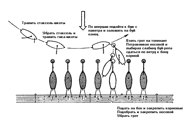 Во всех случаях при постановке парусов на ходу особенно важно не терять хода. Можно, правда, на некоторое время ставить яхту в положение левентик, чтобы облегчить работу на баке, но делать это следует осторожно. Как только рулевой увидит, что яхта вот-вот получит задний ход, необходимо сразу же увалиться на свой курс. Выходить из гавани только под передними парусами приходится и в других ситуациях, например снимаясь с якоря или с бочки в тесной гавани, где трудно развернуться под всеми парусами. Тогда ставят стаксель (а если два передних паруса, то кливер) и выбирают якорь. Пользуясь тем, что стаксель без грота разворачивает яхту почти на месте, уваливаются на фордевинд, а выйдя из гавани, ставят грот. Во всех случаях отходить от причала на швертботе (за исключением крейсерских) значительно проще, чем на килевой яхте, — он много легче и маневренней.