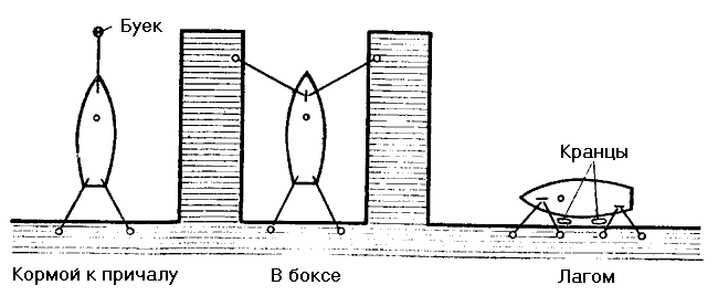 Наиболее распространена швартовка кормой к причалу с заведенным на буек носовым швартовом или с отданным якорем. Чтобы положение кормы относительно причала было стабильным и в случае надобности можно было положить сходню, поданные на берег два кормовых швартова (правый и левый) разносят и крепят под углом к диаметральной плоскости яхты (рис. 131). Варианты такой швартовки — носом к причалу и двумя швартовами (с носа или с кормы) на два буйка. В этих случаях при потравленном швартове, заведенном на буек, первыми крепят швартовы, поданные на причал, после чего выбирают и крепят швартов, заведенный на буек. Если яхта имеет штатную стоянку в боксе, то и с носа, и с кормы обязательно подают по два швартова. Длина их подбирается так, чтобы яхта стояла на одинаковом удалении от стенок бокса (рис.131). На стоянке у причала или борта другого судна лагом яхту нужно швартовать двумя швартовами с носа и двумя с кормы. Одну пару швартовов подают вперед и назад по причалу, чтобы судно не двигалось вдоль него; вторую пару крепят под прямым углом, прижимая яхту к причалу. Между причалом и бортом яхты обязательно вывешивают кранцы (рис. 131).