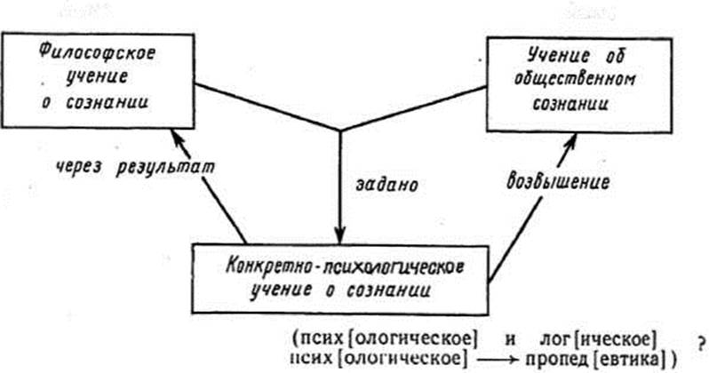, 27 Первый служит предметом изучения исторической науки, исторического материализма. Второй — предметом психологии, УЧЕНИЕ ИСТОРИЧЕСКОГО МАТЕРИАЛИЗМА О СОЗНАНИИ (Для нас это имеет методологический интерес, во-первых, как классическая форма конкретизации философского учения о сознании, во-вторых, с точки зрения необходимости в дальнейшем различить учение об общественном сознании человека и о сознании человеческого общества,) Исторический материализм устанавливает следующие положения о сознании общества: L Люди в процессе общественного производства производят и сознание своего общества. То, в чем и при помощи чего существует сознание общества, есть язык. 2. Материальная жизнь общества есть первичное, сознание общества есть производное, вторичное. Они связаны друг с другом отношением единства, т. е. отношением, предполагающим взаимо-переходы, взаимопроникновение (материальная жизнь, производство определяет сознание общества, сознание общества способно изменять его материальную жизнь). 3. Сознание общества существует как сознание образующих го людей и иначе существовать не может; книга как воплощение факта общественного сознания существует как таковая только в условиях существования способных проникнуть в ее содержание людей. 4. Сознание общества отражает природу и общество. То, как отражается в сознании общества природа и само общество, зависит от того, что представляют собой отношения людей к природе к друг к другу, а это определяется развитием их производства. Иначе: сознание общества определяется бытием общества. 5. Первоначально сознание общества совпадает с сознанием образующих его индивидов и обратно. Это совпадение разрушается вместе с возникновением общественного разделения труда, сознание становится классовым. Уничтожение частной собственности и отделение идеологов уничтожает и ограниченность классового сознания, падает противоречие инд [ивидуального] и общ [ественного] сознания, сознание человека освобождается. Соответственно указанным тезисам о сознании общества предметом наук об общественном сознании является сознание, взятое в его отношении к жизни общества. Итак; сознание присуще человеку — реальному субъекту сознания. Будучи взято в его отношении к объективной реальности, его рассмотрение принадлежит философской науке — теории познания, логике (вопрос об истине»); будучи взято в его отношении к жизни общества («с точки 2й зрения объективно общественных следствий»), его рассмотрение принадлежит науке об обществе; будучи взято в его отношении к осуществляющейся жизни человека, его рассмотрение принадлежит психологии. Значит: учение о сознании необходимо входит в предмет психологии, но оно решительно не совпадает и не должно совпадать с учением о сознании диамата и истмата. Подмена психологических, т\ е. конкретно-научных положений о сознании, положениями гносеологическими или положениями исторического материализма является грубо ошибочной. В силу существующих между этими науками отношений, отражающих объективные отношения их предметов, такая подмена не только делает самое психологию сознания бессодержательной, но и ограничивает возможность дальнейшего полного развития других наук о сознании — по «восходящей линии их иерархии». Каковы эти отношения? = отношения предметов наук? дано: 