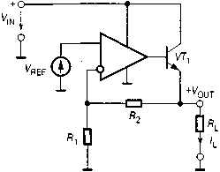 Питание операционного усилителя осуществляется от входного нерегулируемого однополярного напряжения, в данном случае положительного (при регулирующем транзисторе Для схем источников питания такое ограничение не играет роли, поэтому от использования напряжения другой полярности для питания ОУ можно отказаться. Еще одно преимущество подобной схемы состоит в том, что напряжение питания операционного усилителя можно удвоить, не опасаясь превысить его предельно допустимые параметры. Таким образом, стандартные операционные усилители можно использовать в схемах стабилизаторов с входным напряжением до 30 В. Хотя операционный усилитель питается от нестабилизированного входного напряжения V IN, благодаря глубокой отрицательной обратной связи влияние этого фактора на стабильность выходного напряжения невелико. Представленная на следующем рисунке схема стабилизатора может быть выполнена в виде интегральной схемы. Такие схемы выпускаются промышленностью (например, серии