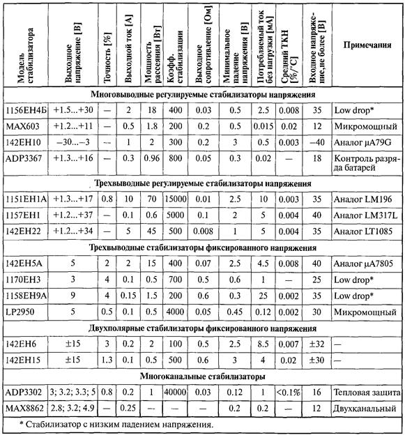 В фирменных описаниях микросхем линейных стабилизаторов часто приводятся графики переходных характеристик — зависимости от времени выходного напряжения при скачкообразном изменении входного напряжения или тока нагрузки, по которым можно судить о быстродействии стабилизатора — времени установления выходного напряжения с заданной погрешностью. К важнейшим эксплуатационным параметрам относятся (см. таблицу): • диапазон допустимых входных напряжений; • номинальное выходное напряжение для стабилизатора с фиксированным выходным напряжением, либо диапазон выходных напряжений для регулируемого стабилизатора; • максимально допустимый ток нагрузки; • максимально допустимая рассеиваемая мощность; • минимально допустимое падение напряжения между входом и выходом стабилизатора при максимальном или дополнительно оговоренном токе нагрузки; • ток, потребляемый стабилизатором в режиме холостого хода; • допустимый диапазон температур окружающей среды.