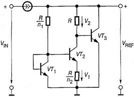 Схема источника опорного напряжения на биполярных транзисторах, разработанная Р. Видларом в 1968 году, приведена на рисунке.