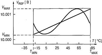 Однако в силу того, что эта зависимость не только не линейна, но даже и не монотонна, ТКН, определенный по этой формуле, сам очень сильно зависит от температуры. Обычно применяется метод поля, при котором задается поле допуска на отклонения опорного напряжения от номинального значения в заданном температурном диапазоне. На следующем рисунке представлен график зависимости опорного напряжения от температуры для прецизионного ИОН AD588.