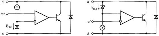 На рисунке а и б изображены схемы источников соответственно втекающего и вытекающего токов на основе трехвыводных регулируемых ИОН. В схеме на рисунке а используется ИОН, опорное напряжение которого равно напряжению между анодом и выводом управления (TLV431 и др.). На рисунке б применен ИОН, опорное напряжение которого равно напряжению между выводом управления и катодом (LM385 и др.). Для обеих схем выходной ток равен