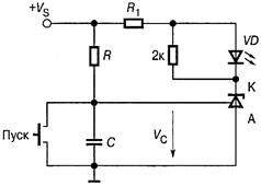 Запуск реле осуществляется кратковременным закорачиванием времязадающего конденсатора С контактами кнопки «Пуск», в результате чего конденсатор разряжается. После размыкания контактов начинается заряд конденсатора через резистор