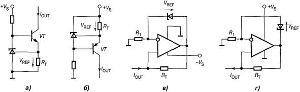 Некоторую погрешность вносит конечный коэффициент усиления тока базы транзистора, поэтому желательно, чтобы он был как можно больше. На рисунках в и г приведены соответственно схемы источников втекающего и вытекающего токов на основе двухвыводных параллельных ИОН и операционных усилителей с однополярным питанием. Выходной ток этих схем определяется по той же формуле.