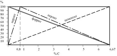 Из таблицы видно, что все сплавы, кроме сплавов с концентрацией углерода до 0, 006 %, являются двухфазными. Они содержат в своем составе две фазы: феррит и цементит. Кроме этого, в системе сплавов Fe – Fe3C можно встретить все три типа связей: и твердые растворы, и механические смеси, и химические соединения. Количественное соотношение фаз и структурных составляющих с изменением концентрации углерода будет постоянно меняться (рисунок 9). Так, например, количество феррита, начиная с 0, 006 и до 6, 67 % углерода, будет уменьшаться от 100 до 0 %. Количество цементита, начиная с 0, 006 %, наоборот, будет увеличиваться от 0 до 100 %. А вот количество перлита, начиная с 0, 02 % углерода, в начале будет расти от 0 до 100 %, и этот рост будет отмечаться в интервале концентраций от 0, 02 до 0, 8 % углерода, затем пойдет уменьшение количества перлита, и при концентрации углерода 6, 67 % он полностью исчезнет. Таблица 1- Фазовый анализ сплавов диаграммы состояния