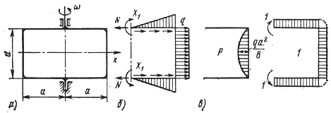 Рассмотрим более сложный пример. Прямоугольная рама постоянного сечения (рис. 15.22, а) вращается вокруг вертикальной оси симметрии с угловой скоростью На горизонтальных элементах рамы интенсивность сил инерции изменяется по линейному закону