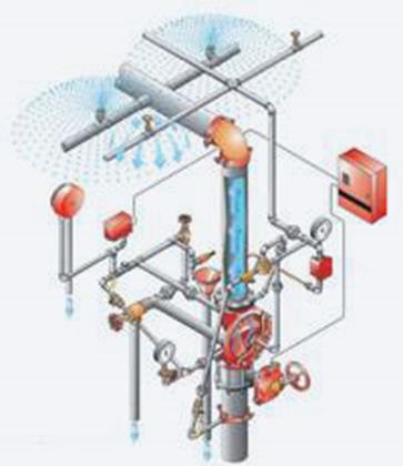 Пожежне устаткування використовують для запобігання, обмеження поширення і гасіння пожежі, а також захисту від пожежі людей і матеріальних цінностей. Одними із надійних засобів для вирішення цих завдань є системи автоматичного пожежогасіння, які на відміну від систем ручного пожежогасіння та систем, керованих оператором, задіюються пожежною автоматикою за об'єктивними показниками й забезпечують оперативне гасіння осередку загоряння без участі людини. Порядок і необхідність установлення систем автоматичного пожежогасіння на підприємствах АПК регламентують НАПБ В.01.057-2006/200 «Правила пожежної безпеки в агропромисловому комплексі України». Виробничі приміщення підприємств АПК, в яких улаштовують системи автоматичного пожежогасіння, зазначено у додатку 3. Конструкційно системи автоматичного пожежогасіння складаються з резервуарів, наповнених необхідною кількістю вогнегасильної речовини, пристроїв керування й контролю, мережі трубопроводів і насадок-розпилювачів. Для визначення кількості розпилювачів, довжини трубопроводів й об’єму вмістищ для вогнегасильної речовини використовують спеціальні розрахункові методики. Системи автоматичного пожежогасіння підрозділяють щодо виду задіяної вогнегасильної речовини: - водяне пожежогасіння (вода); - тонкодисперсне водяне пожежогасіння (дрібнорозпилена вода); пінне пожежогасіння та водо-пінне пожежогасіння (вода з піноутворювачем); - порошкове пожежогасіння (порошки спеціального хімічного складу); - газове пожежогасіння (CO2, аргон, азот, фреони); - аерозольні системи пожежогасіння (подібні до порошків, але частинки на порядок менше за розмірами); Системи водяного пожежогасіння (рис. 7) поділяють на спринклерні (від анг. sprinkler – розбризкувач, розпорошувач), які призначені для локального гасіння пожеж, і дренчерні (від анг. drencher – зрошувач) – для гасіння пожежі водночас у всьому приміщенні або на значній його частині.