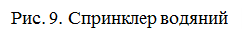 Рис. 7. Елементи системи водяного пожежогасіння Спринклерні установки водяного пожежогасіння призначені для своєчасного виявлення займання, оповіщення про пожежу, локалізації пожежі та локально-поверхневого пожежогасіння. Основними елементами спринклерної системи пожежогасіння є спринклери (рис. 8), які вмонтовано у мережу трубопроводів, розміщених на рівні стелі приміщення. Кожен спринклер герметичний, важливим компонентом ущільнення якого є скляна колба, заповнена рідиною, що розширюється у разі нагрівання. Термочутлива колба зруйнується тоді, коли приріст температури внаслідок пожежі перевищить на 30 ОC максимальну нормальну температуру в приміщення. Після цього вода під тиском через звільнений отвір з мережі трубопроводів потрапляє на розетку спринклера і розпорошується на осередок пожежі.