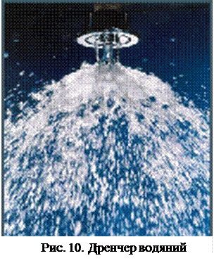 Неопалювані приміщення, що потребують протипожежного захисту, обладнують повітряними спринклерними системами пожежогасіння. У цих системах мережа труб від спринклерів до контрольно-сигнального клапана перебуває під тиском стиснутого повітря. Дренчерні установки водяного пожежогасіння (рис. 10) призначені для: - одночасного гасіння пожежі на всій площі пожежонебезпечного приміщення, де можлива велика початкова швидкість поширення пожежі; - гасіння пожежі з підвищеними витратами води (наприклад, у разі займання горючих природних і синтетичних волокон, пластмас, синтетичного каучуку, лаків, фарб тощо); - створення водяних заслонів (наприклад, у прорізах, де проходять конвеєри, транспортери з вибухо- і пожежонебезпечними речовинами); - зрошення будівельник конструкцій, резервуарів з нафтопродуктами, технологічного обладнання тощо.