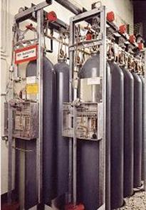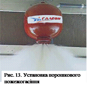 Системи порошкового пожежогасіння мають як переваги (універсальність, висока вогнегасильна здатність, відносно невисока вартість порошку), так і недоліки (злежування порошку і через це обмежений термін його зберігання). Крім того, після потрапляння порошку в зону пожежі відбувається повна втрата видимості, що обмежує залучення до гасіння пожежі пожежників та інших людей. Сучасні порошки можна зберігати при низьких температурах, вони не токсичні та малоагресивні. Системи газового пожежогасіння (рис. 14) застосовують на тих об'єктах, де під час боротьби з пожежею необхідно заповнити весь об'єм приміщення вогнегасильною речовиною. Такі модулі улаштовують, зокрема, у приміщеннях з великою кількістю електроустановок і електронного обладнання.