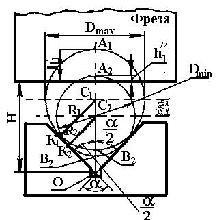 Установочной базой является т. К (К/; К//). Инструмент постоянно настроен на размер Н. Поскольку установочная и измерительная базы не совпадают, то погрешность базирования Для h1: