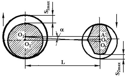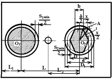 где: δ 0– допуск размера L; S1 и S2 – зазоры. Измерительной базой являются: · для размера L1– ось первого отверстия заготовки; · для размера l2 – ось второго отверстия заготовки. Установочной базой являются цилиндрические поверхности отверстий. В данном случае установочная и измерительная база не совпадают Для определения погрешности базирования надо найти зазоры. Опустив промежуточные выводы, имеем: