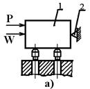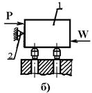Рассмотрим несколько вариантов действия на обрабатываемую деталь сил резания, зажима и их моментов. Первый вариант. Сила зажима W, приложенная к обрабатываемой заготовки 1, и сила резания Р одинаково направлены и прижимают заготовку к опоре 2 приспособления (рисунок 2, а). При этом заготовку удерживает минимальная сила зажима Wмин Второй вариант. Сила зажима W и сила резания Р действуют на обрабатываемую заготовку 1 в противоположных направлениях (рисунок 2, б); требуемая сила зажима