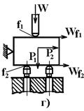 где f 1 и f 2 — коэффициенты трения между поверхностями заготовки и установочными зажимными элементами приспособления. При f = f =0, 1 сила зажима Четвертый вариант. Сила зажима W прижимает заготовку к опорам (рисунок 2, г) при этом одна сила резания Р1 имеет одно направление с силой зажима и прижимает заготовку к нижним опорам, а вторая сила резания Р2 действует в направлении, перпендикулярном к силе зажима. Смещению заготовки в приспособлении препятствуют силы трения, возникающие на плоскостях контакта детали с установочными и зажимными элементами приспособления. Величину силы зажима определяют из соотношения: