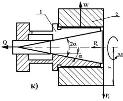 Десятый вариант. Рассмотрим действие силы резания Рz на обрабатываемую заготовку втулки 2, установленную и зажатую на цанговой справке (рисунок 2, к). Сила Р создает момент резания Мрез, которому противодействует момент от силы трения Мтр между установочной поверхностью цанги и заготовкой. Суммарная сила зажима W обрабатываемой заготовки всеми лепестками цанги: