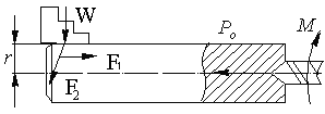 где W - сила зажима заготовки одним кулачком патрона, н; r - радиус обрабатываемой части заготовки, зажатой кулачками, мм; r1 радиус обработанной части заготовки, мм; f — коэффициент трения между поверхностями заготовки и кулачков (зависит от вида поверхности кулачков); Z - число кулачков патрона, Мрез — момент от силы резания Р1. Величину W проверяют на возможность продольного сдвига заготовки силой Р[, по формуле: