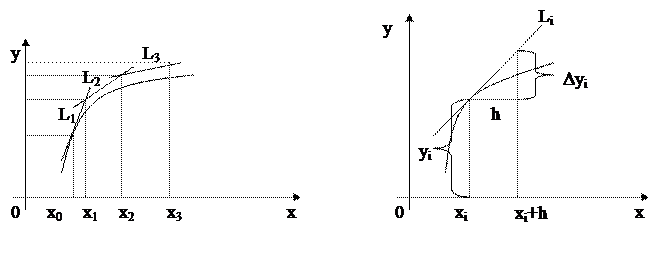 В основе метода Эйлера лежит идея графического построения решения дифференциального уравнения. Однако этот метод дает одновременно и способ нахождения искомой функции в табличной форме. Пусть дано дифференциальное уравнение (6.1). Найти приближенное численное решение этого дифференциального уравнения, т.е. составить таблицу приближенных значений функции у=у(х) удовлетворяющей заданным начальным условиям.