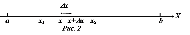Для непрерывных случайных величин невозможно применить закон распределения в формах, приведенных выше, поскольку такая величина имеет бесчисленное («несчетное») множество возможных значений, сплошь заполняющих некоторый интервал. Поэтому составить таблицу, в которой были бы перечислены все ее возможные значения, или построить многоугольник распределения нельзя. Кроме того, вероятность какого-либо ее конкретного значения очень мала (близка к 0)*. Вместе с тем различные области (интервалы) возможных значений непрерывной случайной величины не равновероятны. Таким образом, и в данном случае действует некий закон распределения, хотя и не в прежнем смысле. Рассмотрим непрерывную случайную величину Х, возможные значения которой сплошь заполняют некий интервал (а, b)**. Закон распределения вероятностей такой величины должен позволить найти вероятность попадания ее значения в любой заданный интервал (х1, х2), лежащий внутри (а, b), рис.2.