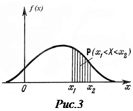 Эту вероятность обозначают Р (х1 < Х < х2), или Рассмотрим сначала оченьмалый интервал значений Х – от х до (х + Dх); см. рис.2. Малая вероятность dР того, что случайная величина Х примет какое-то значение из интервала (х, х + Dх), будет пропорциональна величине данного интервала Dх: dР ~ Dх, или, введя коэффициент пропорциональности f, который сам может зависеть от х, получим: dР = f (х) × D х = f (x) × dx (14) Введенная здесь функция f (х) называется плотностью распределения вероятностей случайной величины Х, или, короче, плотностью вероятности, плотностью распределения. Уравнение (13) – дифференциальное уравнение, решение которого дает вероятность попадания величины Х в интервал (х1, х2): Р (х1 < Х < х2) = Графически вероятность Р (х1 < Х < х2) равна площади криволинейной трапеции, ограниченной осью абсцисс, кривой f (х) и прямыми Х = х1 и Х = х2 (рис.3). Это следует из геометрического смысла определенного интеграла (15) Кривая f (х) при этом называется кривой распределения. Из (15) следует, что если известна функция f (х), то, изменяя пределы интегрирования, можно найти вероятность для любых интересующих нас интервалов. Поэтому именно задание функции f (х)полностью определяет закон распределения для непрерывных случайных величин.