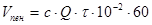 где К1 – коэффициент, учитывающий усадку пены, принимается равным 1, 2 при высоте помещения до 4 м и 1, 5 – при высоте помещения до 10 м, при высоте помещения свыше 10 м определяется экспериментально; К2 – учитывает утечки пены, при отсутствии открытых проемов принимается равным 1, 2, при наличии открытых проемов определяется экспериментально; К3 - учитывает влияние дымовых газов на разрушение пены, для учета влияния продуктов горения углеводородных жидкостей значение коэффициента принимается равным 1, 5. Для других видов пожарной нагрузки определяется экспериментально. Максимальное время заполнения пеной объема защищаемого помещения принимается не более 10 мин. 4. Определяется производительность системы по раствору пенообразователя, м3× с-1: