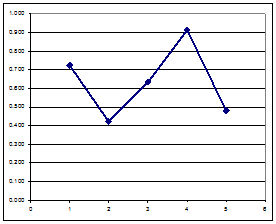 Рис. 22. Вычисление коэффициентов автокорреляции, режим отображения формул График АКФ (коррелограмма) показана на рис.23. Поскольку при лаге, равном четырем, АКФ принимает наиболее высокое значение, равное 0.915, можно утверждать, что ряд имеет сезонную составляющую с периодом равным 4. Можно отметить, что значение АКФ при лаге, равном единице, тоже велико (0.725) - это также служит подтверждением наличия тренда, который целесообразно аппроксимировать линейной функцией.
