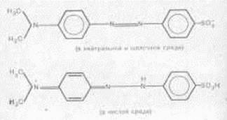 Будова і забарвлення індикатора метилового оранжевого а) в кислому середовищі б) в лужному середовищі