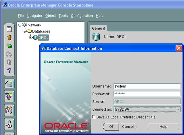 Прежде чем создавать таблицы БД, необходимо создать схему (она будет создана автоматически при создании пользователя) и соответствующее табличное пространство, в котором будут храниться объекты БД. Это можно сделать программно и интерактивно. Интерактивный способ создания реализуется через утилиту Enterprise Manager Console. Для соединения с экемпляром БД Oracle при первом соединении выберите режим Launch standalone, далее в появившемся окне дважды щелкните по экземпляру БД и воспользуйтесь учетной записью System с паролем по умолчанию manager и уровнем доступа SYSDBA.