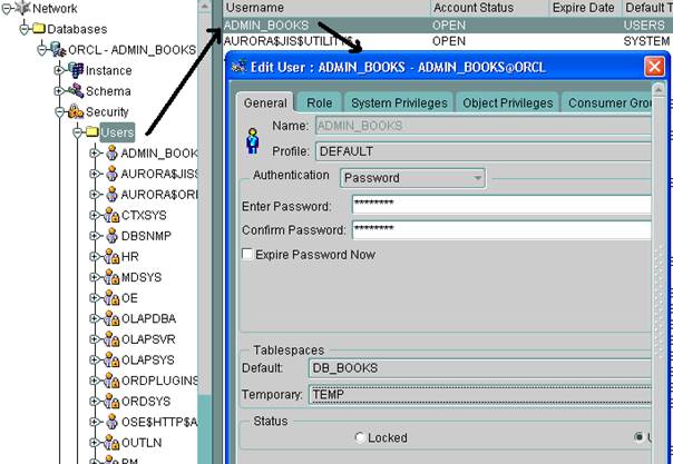 Теперь переопределяем ранее созданного пользователя ADMIN_BOOKS на работу только в этом табличном пространстве.