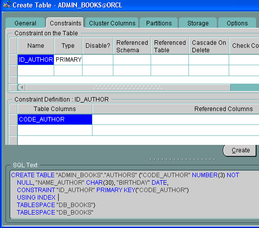 Кроме того, при создании новой таблицы на вкладке Constraints Storage в качестве табличного пространства для хранения индекса выбираем DB_BOOKS.