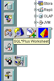 Теже самые операции можно выполнить программно, использую оператору SQL стандарта, реализованные в Oracle как операторы встроенного языка PL/SQL. Для выполнения операторов можно запустить утилуту SQL *Plus Worksheet через меню Windows или через утилиту Enterprise Manager Console, выбрав на левой панели соответствующую пиктограмму, как показано ниже на рисунке.