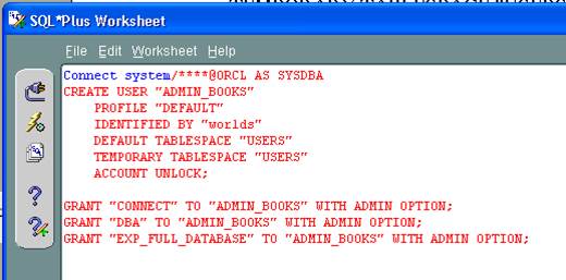 При запуске SQL *Plus Worksheet, подключиться к серверу с помощью пользователя System с паролем по умолчанию manager и уровнем доступа SYSDBA, в качестве SERVICE ввести имя экземпляра БД, в данном примере это ORCL. Вводим набор операторов для создания администратора создаваемой БД. CREATE USER " ADMIN_BOOKS" PROFILE " DEFAULT" IDENTIFIED BY " worlds" DEFAULT TABLESPACE " USERS" TEMPORARY TABLESPACE " TEMP" ACCOUNT UNLOCK;
