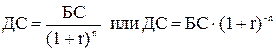 БС – будущая денежная сумма (будущая стоимость); ДС – настоящая стоимость (текущая дисконтированная стоимость); r – норма дисконта; n – число лет, за которое производится суммирование дохода (время, через которое будет получена БС). Оценку будущих доходов в настоящее время называют текущей дисконтированной стоимостью. Зная будущую сумму и ставку процента можно определить ее текущую (современную) дисконтированную стоимость по формуле: