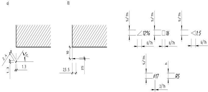 Указания к выполнению задачи 1. Нанесение размеров выполнять по ГОСТ 21.105-91 и 2.307-68*. Общее количество размеров на чертеже должно быть минимальным, но достаточным для изготовления и контроля изделия. Не допускается повторять размеры одного и того же элемента на разных изображениях. Линейные размеры указывают в миллиметрах. Размеры на чертежах указывают размерными числами и размерными линиями. Размерную линию с обоих концов ограничивают засечками в виде толстых основных линий длиной 2…4 мм, проводимых с наклоном вправо под углом 450 к размерной линии (рисунок 13-а). На машиностроительных чертежах взамен засечек применяют стрелки (рисунок 13-б). Размерные линии радиусов дуг и диаметров окружностей ограничивают стрелками. Размерные линии предпочтительно наносить вне контура изображения. Выносные линии должны выходить за размерные линии на 1…3 мм. Минимальные расстояния между параллельными размерными линиями должны быть 7 мм, а между размерной и линией контура – 10 мм и выбраны в зависимости от изображения размеров и насыщенности чертежа. Размерные числа наносят над размерной линией на расстоянии не менее 1 мм и возможно ближе к ее середине. Необходимо избегать пересечения размерных и выносных линий. Размеры, относящиеся к одному и тому же конструктивному элементу (пазу, выступу, отверстию и т.д.), рекомендуется группировать в одном