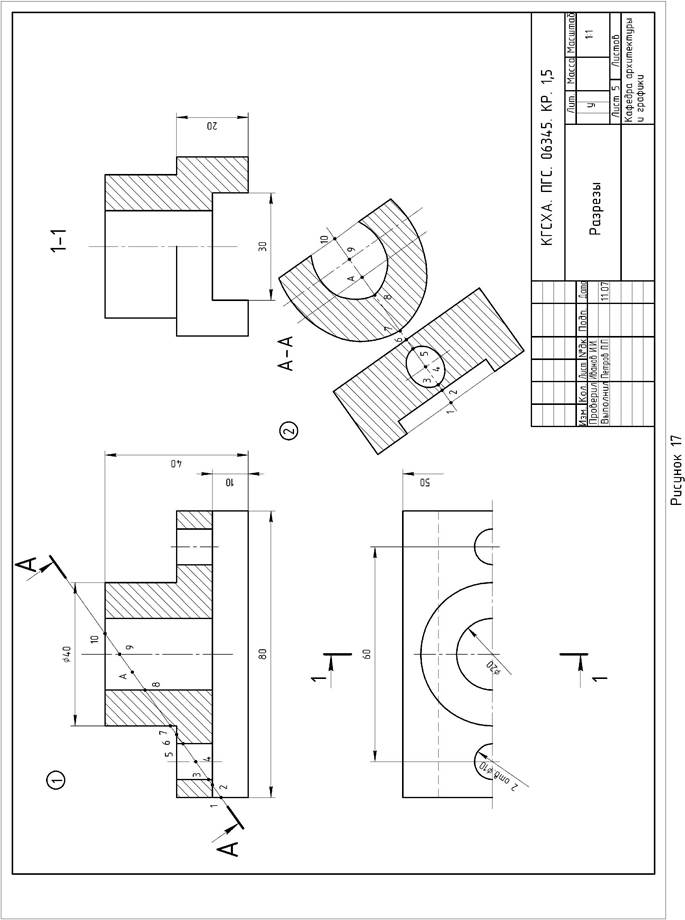 Лист 5 Формат А3. Выполнить две задачи на построение видов, разрезов и сечений детали. Пример оформления листа см. на рисунке 17. Задача 1. Построить три вида детали (вид спереди, вид сверху, вид слева) с необходимыми разрезами по двум данным видам. Индивидуальные задания по вариантам приведены в таблице 6. Указания к выполнению задачи 1. Изучить содержание ГОСТ 2.305-68, обратив внимание на принятые в нем условности и упрощения. Часть вида и часть соответствующего разреза допускается соединять, разделяя их сплошной волнистой линией. Если при этом соединяются половина вида и половина разреза, каждый из которых является симметричной фигурой, то разделяющей линией служит ось симметрии. Если вид, разрез или сечение представляют симметричную фигуру, допускается вычерчивать половину изображения или немного более половины изображения с проведением в последнем случае линии обрыва. Нанести на изображение размеры. Задача 2. По заданному положению секущей плоскости построить сечение детали. Положение секущей плоскости указано в индивидуальном задании. Указания к выполнению задачи 2. Построение сечения выполняют в строгом соответствии с правилами построения проекций в начертательной геометрии, а оформление – в соответствии с ГОСТ 2.305-68. Сечение располагается на свободном поле листа 5. Контур выносного сечения изображают сплошными основными линиями. Плоскость сечения штрихуют. Сечение сопровождают надписью по типу «1-1», «А-А». Номер шрифта надписи в два раза больше, чем номер шрифта, принятый для размерных чисел на данном чертеже.