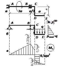 Участок DЕ. Так как этот участок параллелен оси вращения, то интенсивность сил инерции на нем будет постоянна и равна рiDE = q = const. Эпюры инерционных сил, действующих на рассматриваемую систему, показаны на рис. б. Далее определяем изгибающие моменты и строим эпюру Ми. На участке DE эпюра Ми – парабола, на участке DC – прямая, параллельная стержню CD, на участке СB – наклонная прямая и на участке АВ также наклонная прямая (рис. в). У к а з а н и е. Равнодействующая распределенной вдоль стержня CD инерционной нагрузки pi равна площади эпюры pi, т.е. в данном случае площади треугольника (R = aq /2). Из эпюры Ми видно, что максимальное значение изгибающего момента будет в сечении В