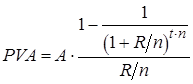 где PVA – текущая стоимость аннуитета, руб.; A – сумма аннуитета, то есть сумма равновеликих равномерных поступлений денежных средств, руб. Если R установлена как годовая ставка доходности (норма дисконта), а поступления производятся чаще, чем раз в год (ежеквартально, ежемесячно и т.д.), то формула примет вид: