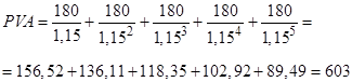 Пример 4: Инвестор рассматривает возможность вложения средств в объект недвижимости с целью получения дохода в виде арендной платы в течение пяти лет. Ежегодная сумма арендной платы, которая будет вноситься в конце каждого года, составит 80 тыс. руб. Какую максимальную цену целесообразно заплатить за объект сегодня при ставке дисконта 15 % годовых. Решение: Дано: A=1 80; R= 0, 15; t= 5 Вариант решения 1: