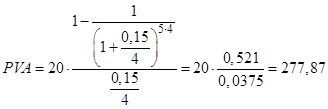 Пример 5: Инвестор рассматривает возможность вложения средств в объект недвижимости с целью получения дохода в виде арендной платы в течение пяти лет. Ежеквартальная сумма арендной платы, которая будет вноситься в конце каждого квартала, составит 20 тыс. руб. Какую максимальную цену целесообразно заплатить за объект сегодня при ставке дисконта 15 % годовых. Решение: Дано: A= 20; R= 0, 15; t= 5, n= 4 Вариант решения 1