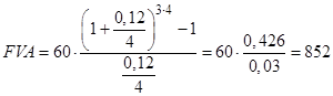 Пример 7: Семья предполагает приобрести через 3 года квартиру. С этой целью открыт жилищный накопительный счет в банке, на который в конце каждого квартала вносятся по 60 тыс. руб. Какая сумма накопится на счете через три года, если по счету начисляется 12 % годовых? Решение: Дано: A=60, R=0, 12, t=3, n=4
