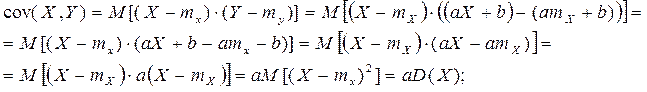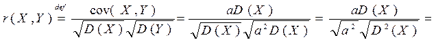Теорема. Если случайные величины X и Y связаны линейной зависимостью Y=aX+b, то коэффициент корреляции: