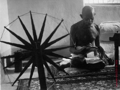 " Ганди возле колеса прялки" – портрет одного из наиболее влиятельных людей 20-го столетия, которого могло бы не быть, благодаря строгим требованиям Махатмы Ганди. Получив редкую возможность сфотографировать Индийского лидера, штатный сотрудник журнала Life Маргарет Бурк-Вайт приготовила все для съемки, когда секретари Ганди остановили ее; раз она собралась сфотографировать Ганди возле вращающегося колеса (символ борьбы Индии за независимость), ей надо было самой научиться обращаться с прялкой. Но это было не все, к аскетическому Махатма нельзя было обращаться (это был его день молчания). А так как он не терпел яркого света, Бурк-Вайт было позволено сделать только три вспышки. Пройдя через препятствия, Бурк столкнулась еще с одним: из-за влажной индийской погоды испортилось её оборудование. Когда пришло время снимать, первая вспышка не сработала. Когда сработала вторая вспышка, она забыла вставить слайд, отсняв впустую. Она уж было думала, что все кончено, но третья попытка удалась: она сделала снимок, который стал самым известным образом Ганди. Это был почти самый последний портрет в его жизни, он был убит менее чем через два года после этого.