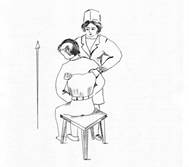 Встаньте лицом к сидящему пациенту сбоку от него, одну ногу поставьте рядом с ним, а другую – впереди него, зафиксировав своими коленями колени пациента. Просуньте согнутые в фалангах пальцы в подмышечные впадины спереди дальнего от вас бока пациента и сзади находящегося ближе к вам бока. Просовывайте ваши пальцы как можно дальше ладонями вверх, оставляя большие пальцы внеподмышечных впадин.
