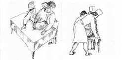 Пациент прижимает свои руки к телу и если функции одной из них ослаблены, захватывает запястье слабой руки более крепкой рукой. Вы находитесь непосредственно за пациентом. Просуньте ваши руки между руками и грудью пациента с обеих сторон и захватите руки пациента как можно ближе к запястью.