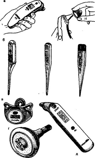 . Цифровые и инфракрасные термометры: а - инфракрасный термометр для измерения температуры в ушной раковине с защитными колпачками; б - цифровые термометры для измерения температуры в полости рта, подмышечной области и анальном отверстии; в - цифровой термометр-«соска»; г - цифровой термометр ректальный; д - мгновенный цифровой термометр
