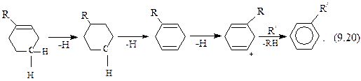 Пятичленные циклы изомеризуются в шестичленные и далее ароматизуются. 9.3.5.Превращения аренов. Незамещенные арены при каталитическом крекинге стабильны. Монометилзамещенные арены по реакционной способности сравнимы с алканами, арены с более длинными алкильными заместителями по стабильности близки к алкенам. Основной реакцией для них является деалкилирование. Это объясняется тем, что ароматическое кольцо обладает большим сродством к протону по сравнению с алкил-ионом:
