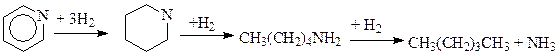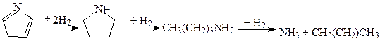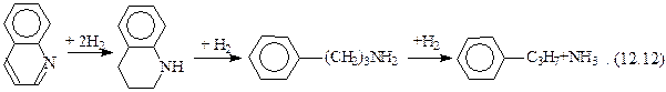 Кинетика гидрирования сероорганических соединений зависит от сложности их строения. Скорости гидрирования различных сернистых веществ находятся в следующем соотношении (в скобках относительные скорости): меркаптаны, дибензилсульфиды (7) > вторалкилсульфиды (4, 3 – 4, 4) > тиофан и его гомологи (3, 8 – 4, 1) > первичные сульфиды (3, 2) > производные тиофена и диарилсульфиды (1, 1 – 2, 0). Среди представителей одного класса соединений скорость гидрирования уменьшается с увеличением молекулярной массы вещества. Процесс гидрирования сернистых соединений описывается уравнением реакции первого порядка. Кажущаяся энергия активации различных реакций обессеривания находится при 350 – 425 оС в пределах 46 – 48 кДж/моль. Лимитирующая стадия процесса – внутренняя диффузия молекул сырья. 12.1.2. Реакции азотсодержащих органических веществ. Азот в нефти и нефтепродуктах содержится почти исключительно в гетероциклических структурах – производных пиррола и пиридина. Гидрогенолиз связи С – N протекает труднее, чем связи С – S. Наиболее легко гидрируются амины: