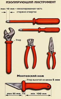 - ключи гаечные разводные, трещоточные; - плоскогубцы, пассатижи; - кусачки боковые и торцевые; - отвертки, - монтерские ножи нескладные и т. п. Изолирующие рукоятки выполняются в виде диэлектрических чехлов, насаживаемых на ручки инструмента или неснимаемого однослойного или многослойного покрытия из влагостойкого, маслобензостойкого, нехрупкого электроизоляционного материала, наносимого методом литья под давлением, окунания и т. п. Поверхность изолирующего покрытия не должна быть скользкой. Форма и рифление поверхности изолирующих рукояток должны обеспечивать удобство пользования инструментом. Соединение изолирующих рукояток с ручками инструмента и изоляцией стержней отверток должно быть прочным, исключающим возможность их взаимного продольного перемещения и проворачивания при работе. Инструмент с многослойной изоляцией должен быть заменен, если из-за верхнего слоя появляется нижний. Если покрытие состоит из трех слоев, то при повреждении верхнего слоя инструмент может быть оставлен в эксплуатации. При появлении нижнего слоя изоляции инструмент следует немедленно изъять из эксплуатации Правила пользования инструментом. Перед каждым применением инструмент должен быть осмотрен. Изолирующие рукоятки инструмента не должны иметь раковин, трещин, сколов, вздутий и других дефектов, которые приводят к ухудшению внешнего вида и снижению механической и электрической прочности. При хранении и перевозке инструмент должен быть обязательно предохранен от увлажнения и загрязнения.